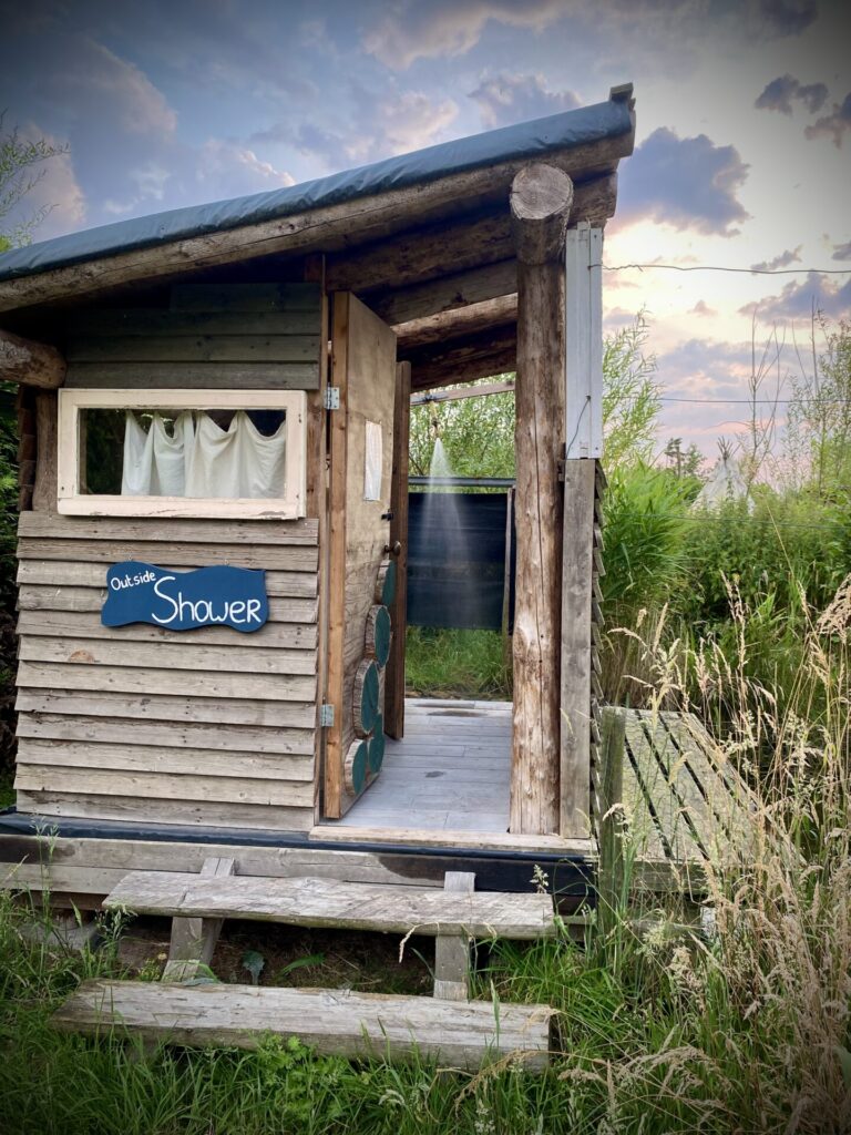 Het Natuurkampeerterrein beschikt naast de reguliere (sanitaire) voorzieningen, over enkele ‘off-grid’ voorzieningen. Zo houd je je footprint laag en de natuur blij 🙂 Zo is er onder meer een composttoilet, een buitenkeuken met regenwatervoorziening en een buitendouche. Alles is gebouwd en geplant volgens de wetten van permacultuur: in balans en samenwerking met de natuur.